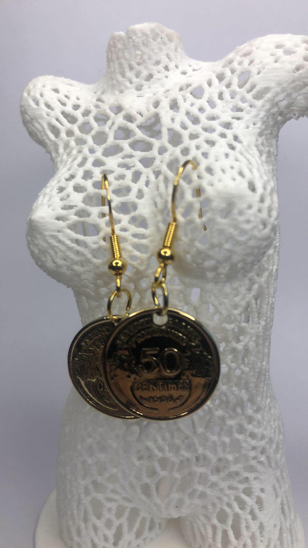Boucles d'oreilles façonnées avec d'authentiques pièces de 50 Centimes de Morlon, en Laiton . les crochets des boucles d'oreilles son en plaqué or